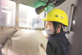 在江西金力永磁科技公司的成型車間里,溫小珍戴著安全頭盔,全神貫注地查看著機器運行情況。