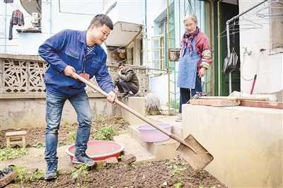 4月25日,在合肥市西園新村徐一琦老人家院內,吳雄飛(左)幫老人打理菜園。 新華社記者 杜 宇攝