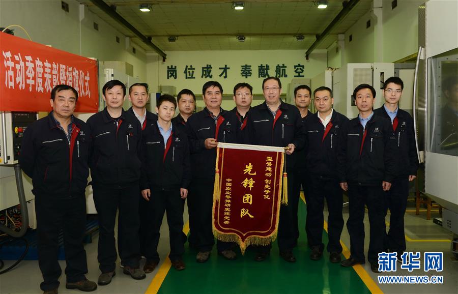 在位于河南洛陽的中航工業(yè)空空導(dǎo)彈研究院十一分廠,魯宏勛(右五)帶領(lǐng)的班組獲得導(dǎo)彈院“型號(hào)建功先鋒團(tuán)隊(duì)”錦旗(2013年4月18日攝)。新華社發(fā)