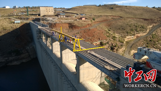 麥特隆水壩在原本的設(shè)計中壩頂沒有交通功能,兩岸村民需繞道幾公里才能到達對岸。見此狀,水電八局向項目業(yè)主提出了增橋方案。壩頂橋預(yù)制梁安裝時,工程量雖小但當?shù)胤职桃獌r很高,購買一臺架橋機自己安裝既昂貴又浪費。于是,劉杰便從工地閑置的廢舊鋼材中想辦法。他利用項目部二十幾噸閑置鋼材,采用杠桿原理設(shè)計制作出了一臺簡易架橋機,僅12天時間就完成了壩頂橋預(yù)制梁的架設(shè),為兩岸村民架起了一座“幸福橋”,直接節(jié)約設(shè)備成本與工期成本超過150萬元人民幣。為此,水電八局將這臺簡易架橋機命名為“劉杰架橋機”。