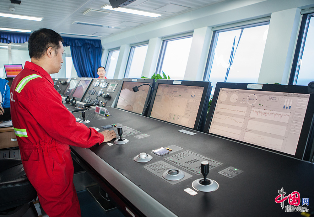 越是高精尖的設備對操作者的技術要求就越高。作為高級定位師,他們負責掌控動力定位系統,確保船舶“紋絲不動”。此外,在平臺航行、移位過程中,定位師還負責制定具體航線。他們不僅需要密切關注設備的運行,還需注意氣象和海況的變化,其中臺風就是作業的最大風險之一,因為平臺移動速度慢,有時還懸掛隔水管,不可能駛離太遠,定位師的操作直接關系到整個平臺船體結構的安全及人員安全。中國網記者 倫曉璇 攝