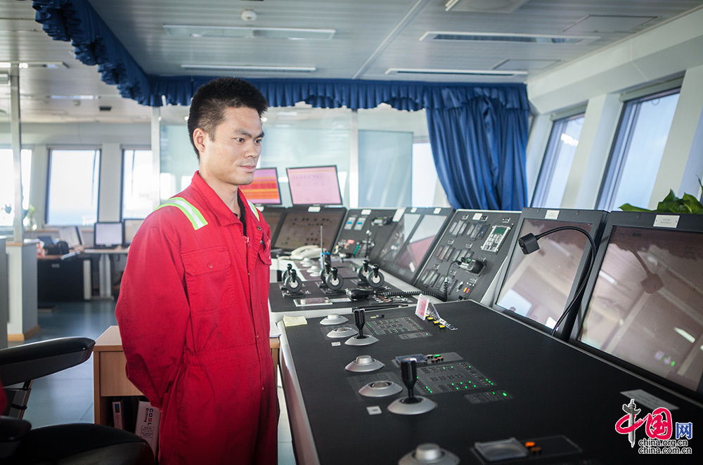 在我國自行設計建造并擁有自主知識產權的首座深水半潛式鉆井平臺建成后,蓋鳳喜放棄國外平臺薪酬優越的工作,毅然選擇加入國內首座深水動力定位平臺的作業團隊,參與運營前調試,海試等,以及最后在海上的實際運營。他帶領團隊完成動力定位作業所必須的操作手冊及程序,為安全作業提供保障。到目前為止該平臺保持良好的定位安全記錄,優于國外同類型定位系統的平臺在該區域的作業水平。中國網記者 倫曉璇 攝