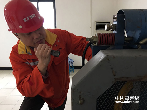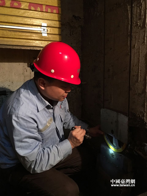 張東平在進行電梯故障檢測與維修。(重慶市特種設備檢測研究院供圖 中國臺灣網發)