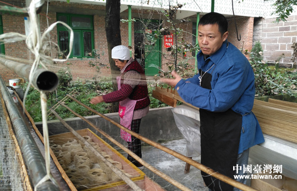 李儉康在為苧麻纖維上漿。(中國臺灣網 王文英攝)