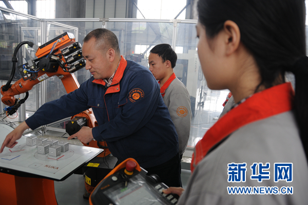 胡明華在機器人應(yīng)用工程實驗室里指導學生們進行機器人操作學習。新華網(wǎng) 聶晨靜 攝