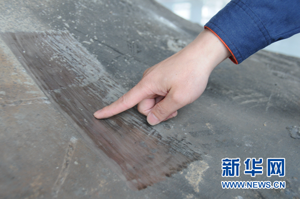 胡明華為記者展示用自動編程自適應(yīng)機器人自動打磨系統(tǒng)打磨的鑄鍛件表面部分。新華網(wǎng) 聶晨靜 攝
