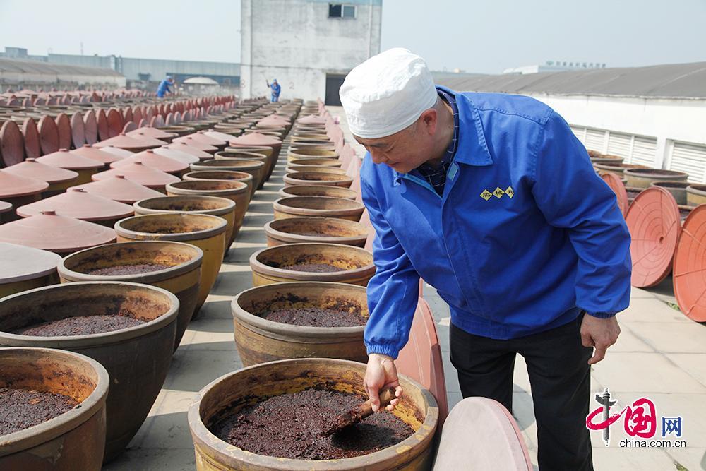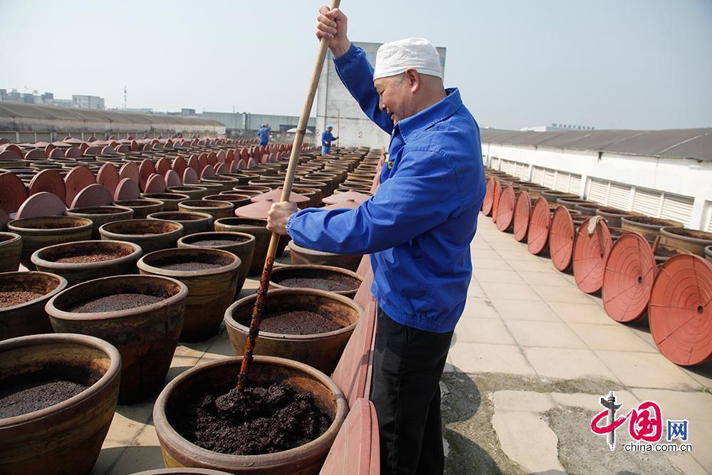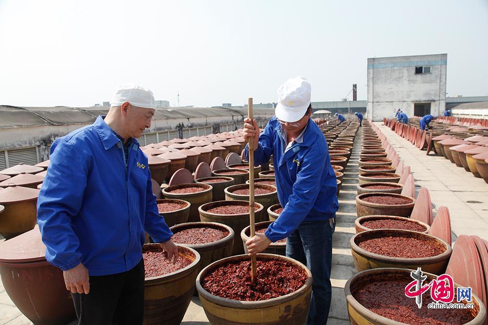 據了解,一缸郫縣豆瓣每天翻曬12次,三年特級郫縣豆瓣至少經歷翻曬13140下,五年特級郫縣豆瓣至少經歷翻曬21900下。中國網 李佳攝影