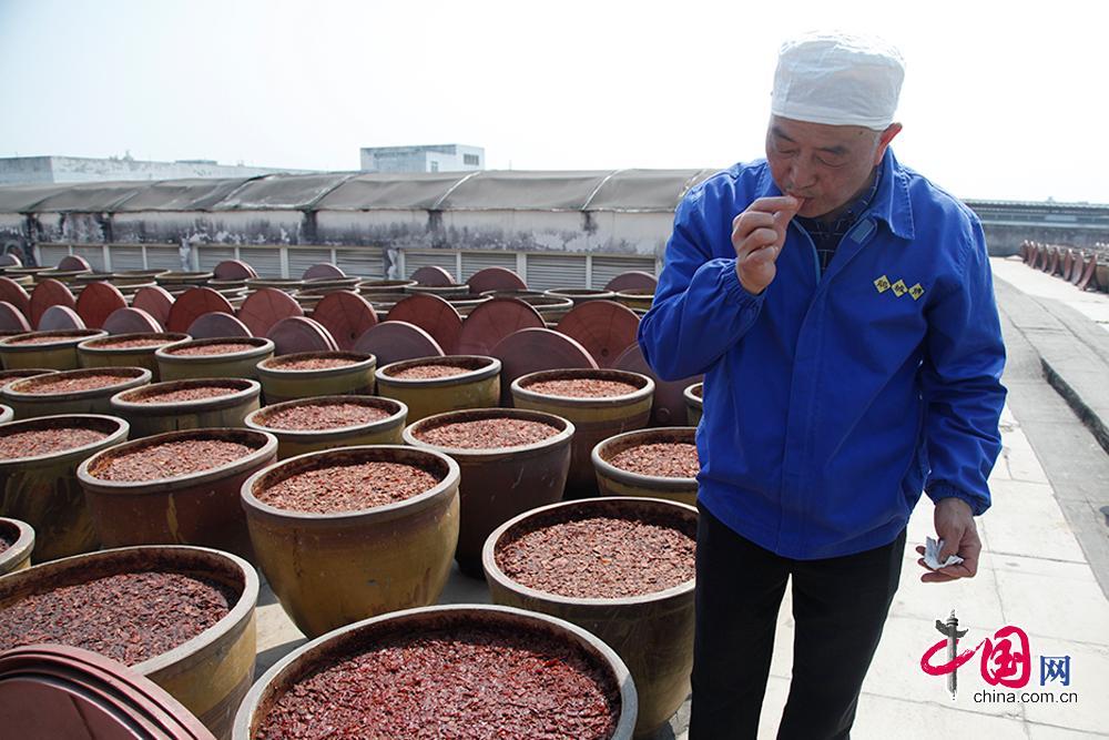 中國網3月28日四川訊(記者 李佳) 300多年的歷史,郫縣豆瓣已深深融入到川菜的風味中,也成為川菜不可或缺的調味料,被稱為“川菜之魂”,其傳統制作技藝入選國家非物質文化遺產。“我15歲的時候就開始進入豆瓣廠做零工,1978年正式入廠,跟著師傅學習手藝,當時每個師傅帶四、五個徒弟,但是幾十年下來堅持到最后的不多。我所做的不僅僅是為了保留傳統的制作技藝,更是為了留住郫縣豆瓣獨特的味道。”張安秋在四川省郫縣豆瓣股份有限公司從事豆瓣釀制調配工作,2018年被授予“全國輕工行業勞動模范”稱號,他用樸實無華的語言詮釋了四十年來的堅守。