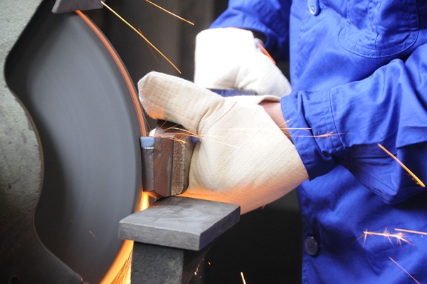 龍小平為記者現場演示車工最基礎的一道工序——磨刀。新華網 聶晨靜 攝
