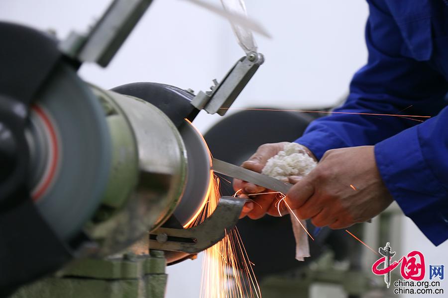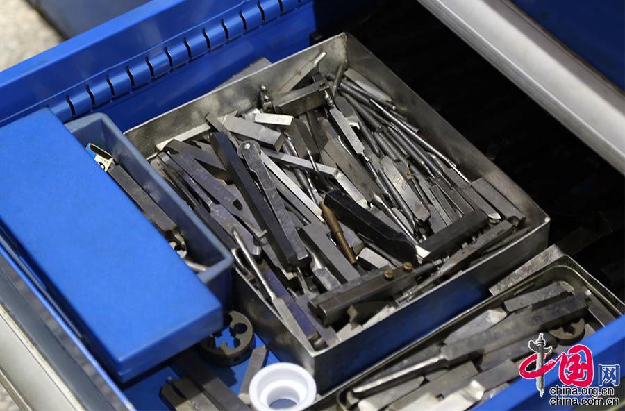 這一箱子的工具都是師傅們手工磨制的,磨刀是車工入門的基本功。劉朝輝剛入行做學徒的幾個月,都是在磨刀中度過的。這項工作非常枯燥,但是必不可少。能不能通過這幾個月枯燥工作的挑戰,是判斷一個人能否入行的重要“考核標準”。工匠所有的記憶和感覺,都在手上。中國網記者 楊楠攝影