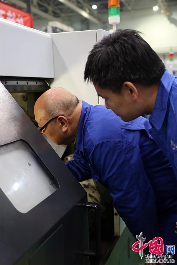 劉朝輝與師傅王保森在研討車刀的角度。至今他都很感謝師傅,這是他進入行業的領路人。剛走出校園的劉朝輝還帶著濃濃的理論色彩,不夠“接地氣”。然而把產品從“圖紙”變為“現實”,需要不斷的琢磨領悟與實踐,在師傅的引導下,他發揮自己的數控特長,將書本學到的知識在平日的工作里慢慢的融會貫通,工作也越來越得心應手。手藝,就是這樣代代傳承、完善下來的,沒有捷徑。中國網記者 楊楠攝影