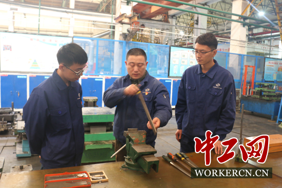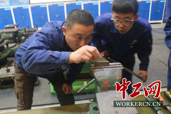 張學(xué)海在工作中指導(dǎo)徒弟。中工網(wǎng)記者朱晶晶攝