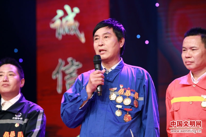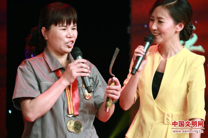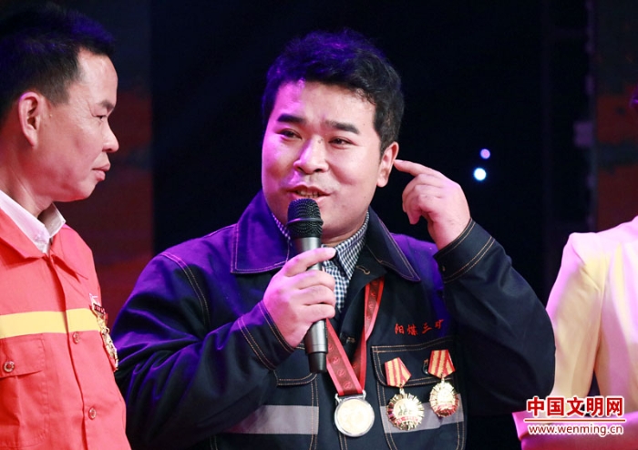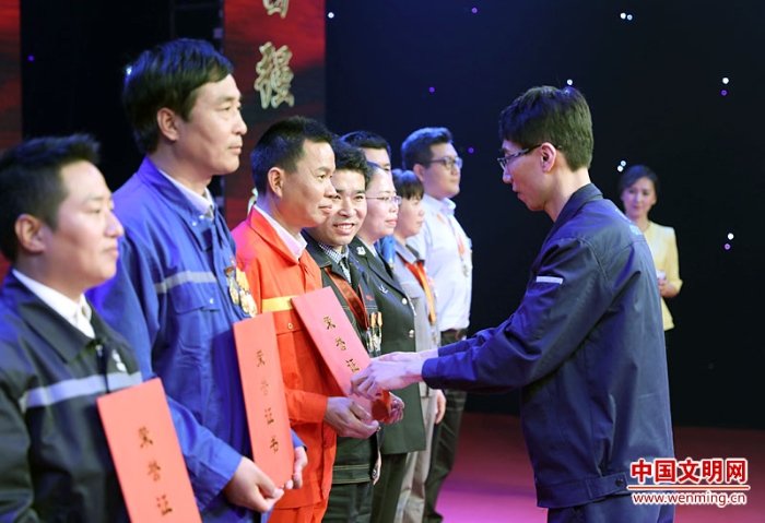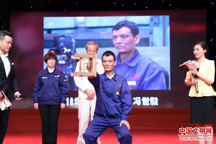 2017年“最美職工”、國家科技進步二等獎、全國五一勞動獎?wù)隆⑷珖毠ぢ殬I(yè)道德建設(shè)標兵、中國青年五四獎?wù)芦@得者,中國航發(fā)沈陽黎明航空發(fā)動機(集團)有限責任公司職工、高級技師洪家光,為“最美職工”頒發(fā)榮譽證書。中國文明網(wǎng) 王楠 攝