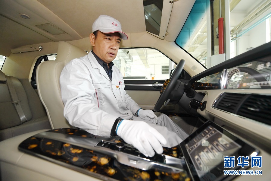 吳殿維在一汽紅旗工廠檢查一輛紅旗轎車的內部功能(4月25日攝)。國慶閱兵、APEC會議、G20杭州峰會……這些舉世矚目的活動中少不了“國車”紅旗的身影。耀眼的品牌背后,一支作風過硬的車輛服務保障團隊保證著出行任務的萬無一失。一汽工人吳殿維就是其中的一員,被譽為不辱使命的“國車衛士”。新華社記者 張楠 攝
