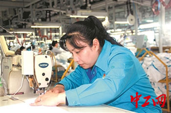 縫制組長王軍,一年四季總是操著一副沙啞的嗓子指導工人,任勞任怨,她說:“我們都以謝秀榮為榜樣。”