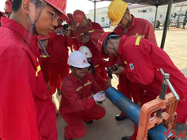 七月流火,酷暑難耐。冀東油田井下作業公司教學井場竟仍有一群人圍攏在一起,全然不顧烈日的灼烤,聚精會神地聽著培訓師的講解。這位培訓師穿戴整齊,手里拿著一把管鉗,一邊拆解和組裝著下井工具,一邊講解著具體的原理結構和操作要領,手口不停,洪亮的聲音響徹井場,他就是工藝研究所大修室主任劉水淼。