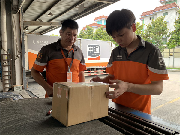 蔣教芳在指導李慶恒(右)打包快件
