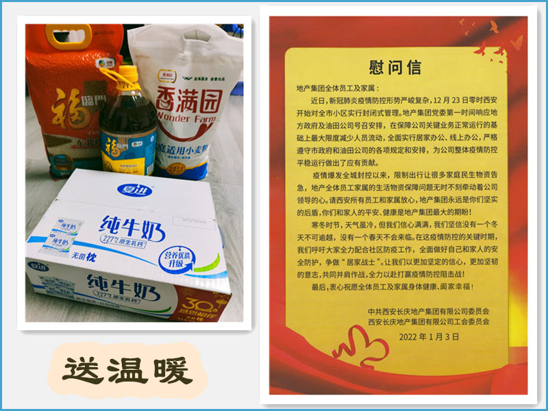 疫情發生后,長慶油田公司工會第一時間發布《共克時艱抗疫有我》的倡議書,以及《關于開展2022年元旦春節期間送溫暖活動及疫情期間員工服務保障工作的通知》,號召各級工會全面行動起來,聚焦困難群體,下撥專項幫扶資金,重點關注孤寡獨居,一老一少,確診、疑似及隔離觀察人員、突發疾病員工、海外員工家屬等群體,定期進行開展慰問,把組織關懷落細落實,解決員工后顧之憂,維護油田發展穩定大局。