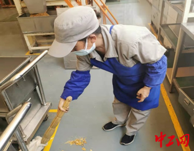 工人正在用帆布袋包裹的掃帚清掃落地煙葉
