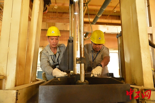 工人對梗打包機壓頭進行改造 孫惟剛 攝
