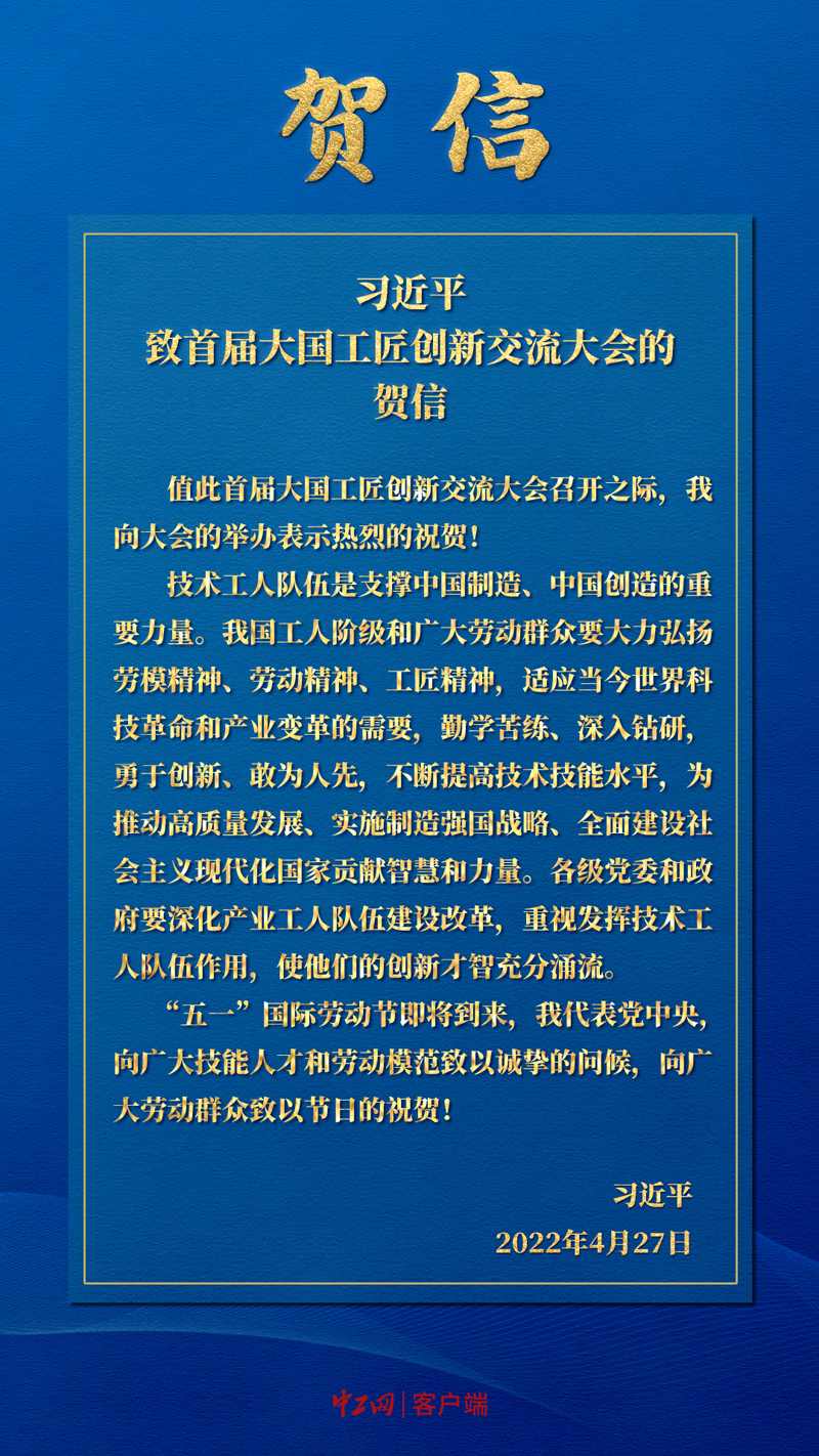 新華社北京4月27日電 首屆大國工匠創新交流大會27日上午在京開幕。中共中央總書記、國家主席、中央軍委主席習近平發來賀信,向大會的舉辦表示熱烈的祝賀,并在“五一”國際勞動節到來之際,代表黨中央向廣大技能人才和勞動模范致以誠摯的問候,向廣大勞動群眾致以節日的祝賀。