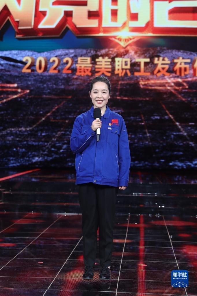 南京三樂集團有限公司宇航產品室主任、工程師成紅霞在“最美職工”發布儀式上(4月22日攝)。