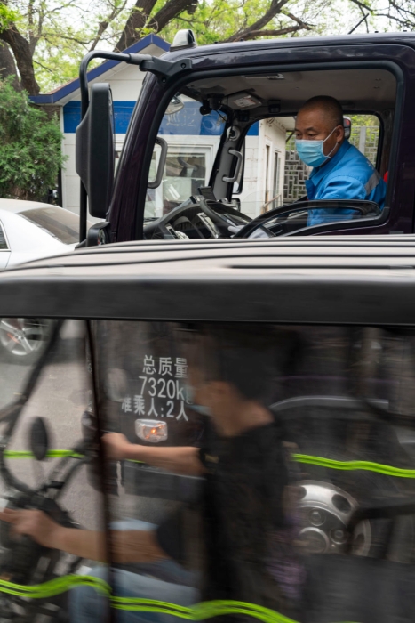 4月25日,在北京國子監附近,孫志寶駕駛抽糞車穿過狹窄的胡同。
