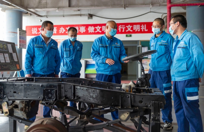 ? ? ? ? ?4月21日,在北京環衛集團,孫志寶(中)給同事們講解汽車結構。