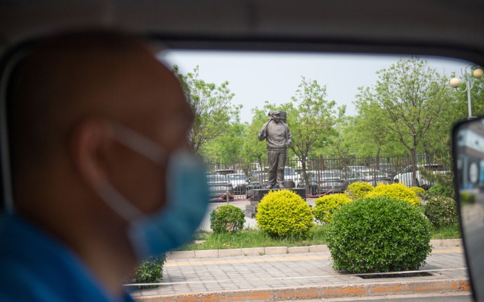 4月25日,孫志寶駕駛抽糞車經過北京環衛集團外的時傳祥雕塑。