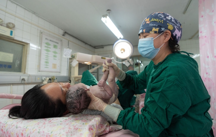 ↑張淑萍(右)將新生兒抱到孩子的媽媽旁邊(5月10日攝)。