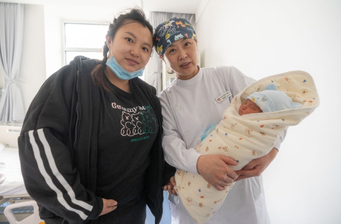 ↑清晨,張淑萍的同事張雪給新生兒稱體重(5月10日攝)。