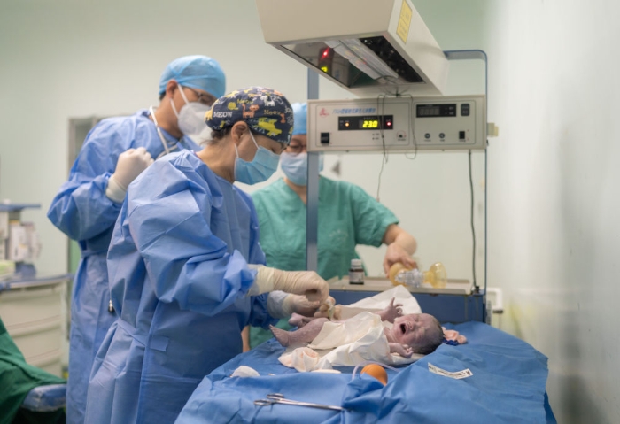 ↑張淑萍(右一)在手術室內準備迎接新生兒(5月9日攝)。