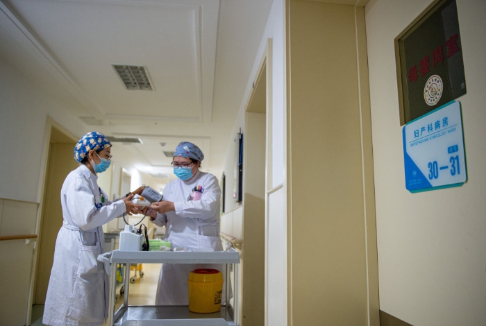 ↑凌晨,張淑萍的同事馬彥(左)和梁元準備進入病房給病人測量血壓(5月10日攝)。