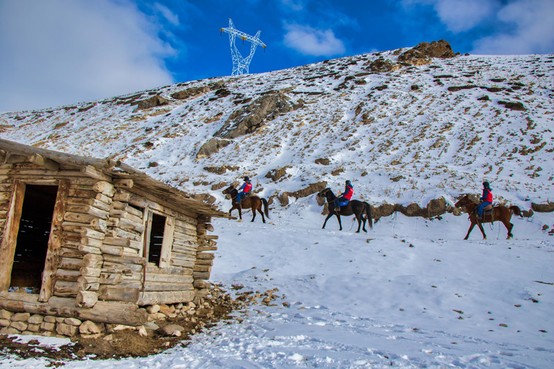 圖為阿曼吐爾·依沙木丁帶隊冬季騎馬巡視天山上的輸電線路(攝影/劉顯剛)