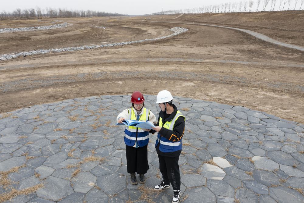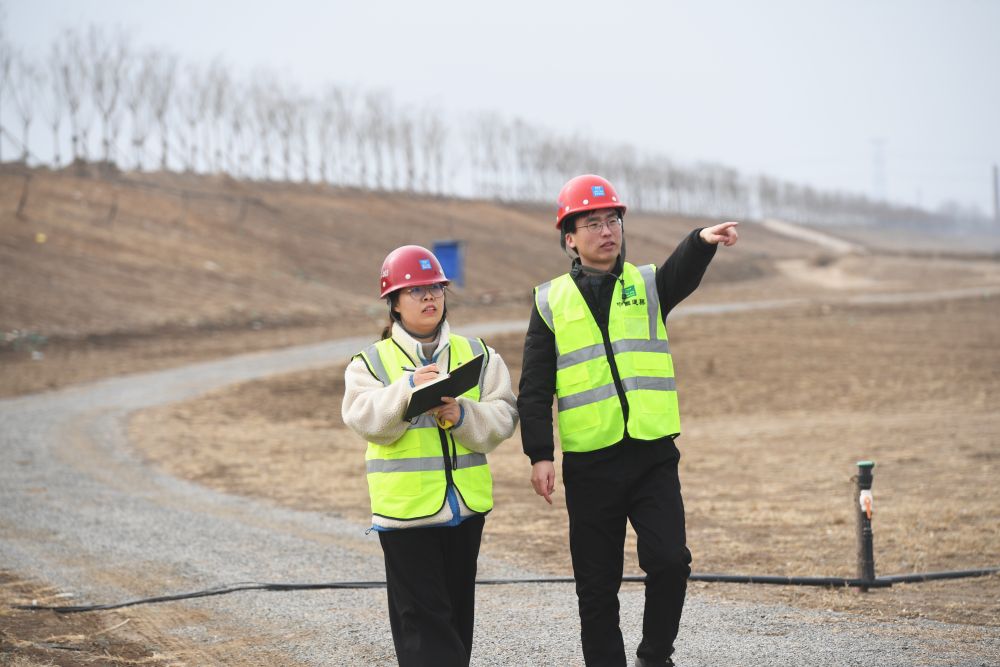 楊鑫博(左)和同事在雄安唐河河谷郊野公園項目現場工作(2月15日攝)。新華社記者 朱旭東 攝