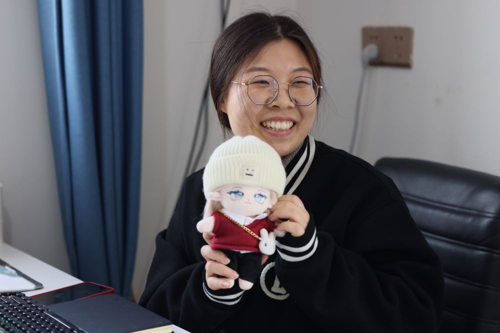 楊鑫博在項目部辦公室展示新購買的玩偶(2月15日攝)。新華社記者 邢廣利 攝