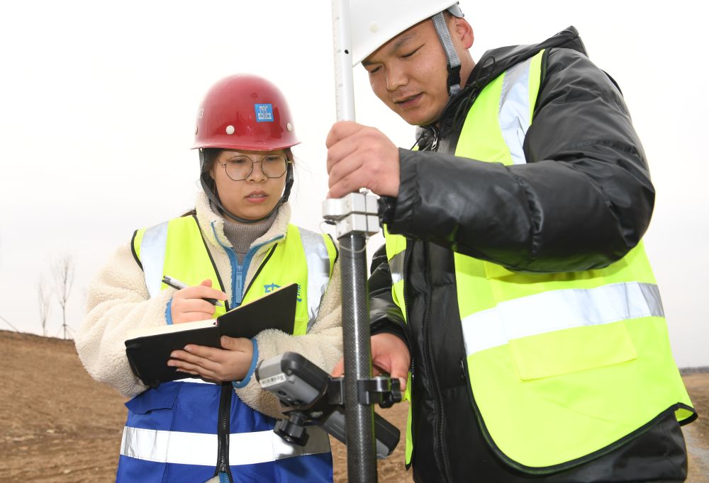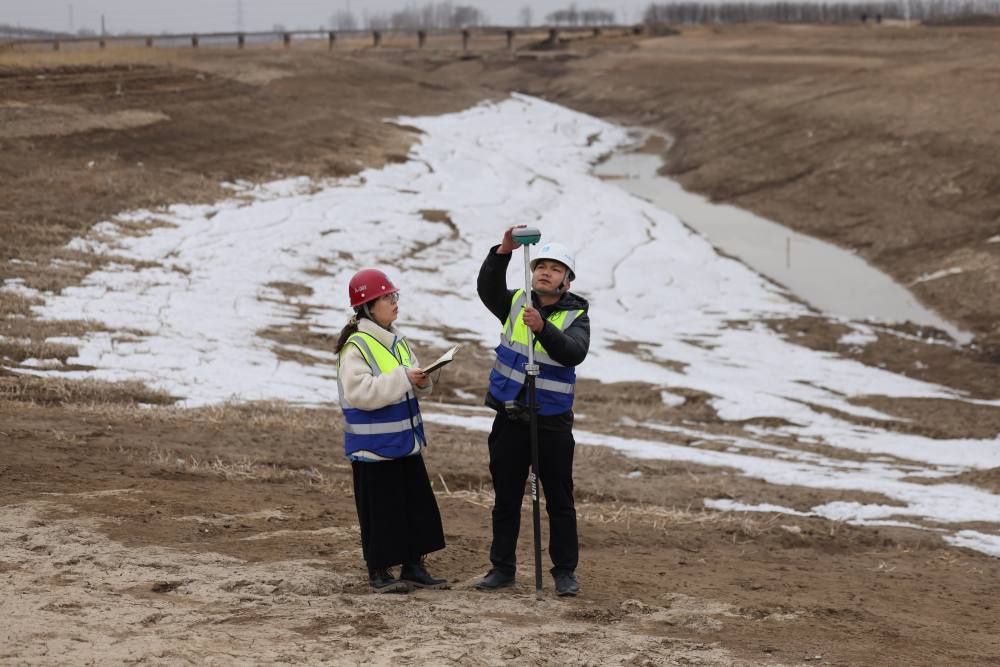 楊鑫博(左)和同事在雄安唐河河谷郊野公園項目現場勘測(2月15日攝)。新華社記者 邢廣利 攝