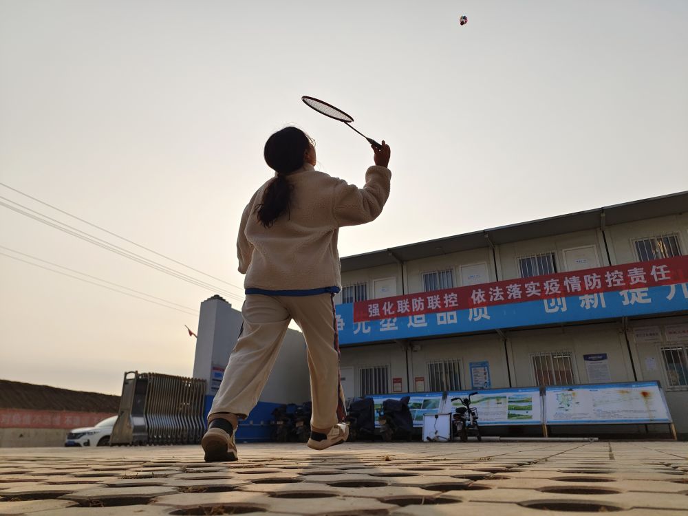楊鑫博在項目部小院打羽毛球(2月15日攝)。新華社記者 邢廣利 攝
