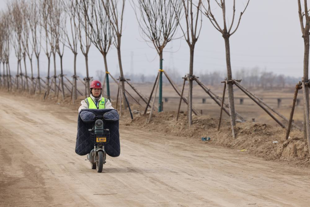 楊鑫博騎行前往雄安唐河河谷郊野公園項目現場(2月15日攝)。新華社記者 邢廣利 攝