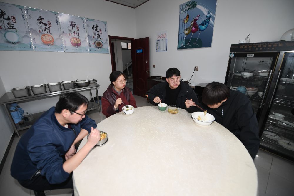 楊鑫博(左二)和同事在項目部食堂吃飯(2月15日攝)。新華社記者 朱旭東 攝