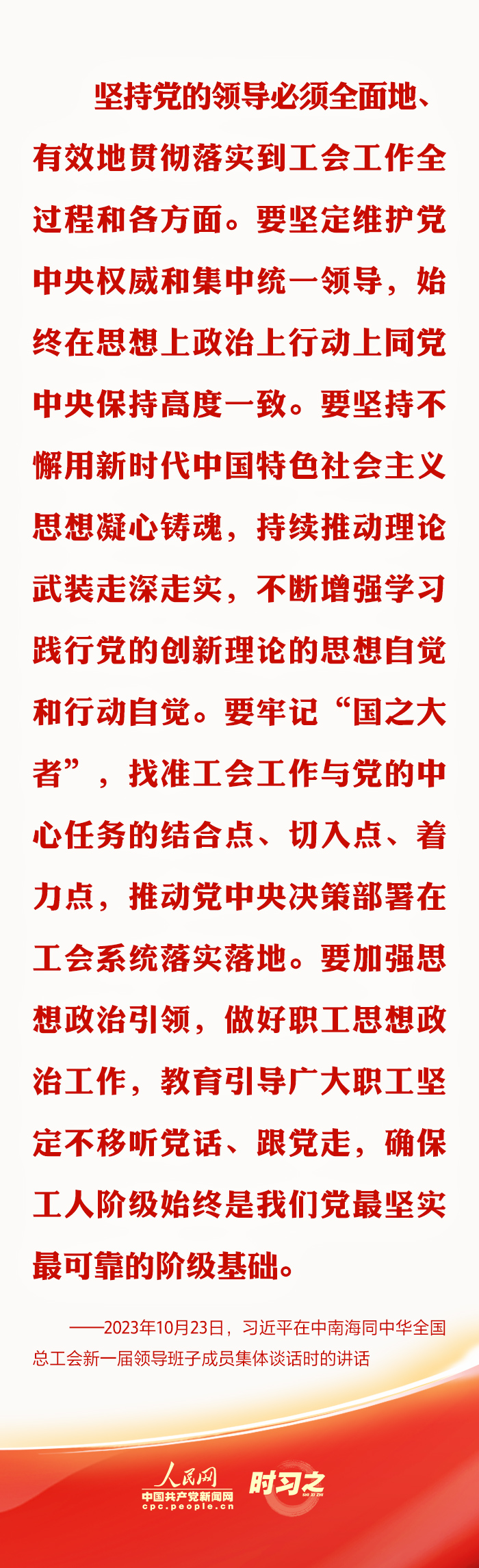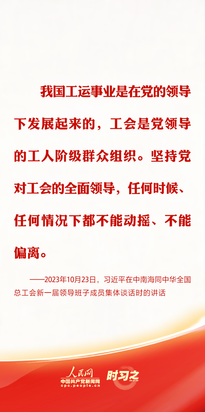 中共中央總書記、國家主席、中央軍委主席習近平10月23日下午在中南海同中華全國總工會新一屆領導班子成員集體談話并發表重要講話?!皥猿贮h對工會的全面領導,任何時候、任何情況下都不能動搖、不能偏離?!绷暯娇倳浽诙鄠€場合強調加強思想政治引領的重要性,指引新時代工會工作蓬勃發展。