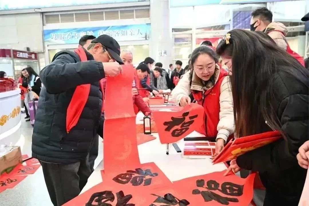 中工網訊 據云南省總工會微信公眾號消息,1月26日,春運開始的第一天,昆明火車站候車廳內喜氣洋洋、年味濃郁,云南省總工會開展2024年“送萬福 進萬家”書法公益志愿服務活動,為職工群眾送上新年祝福。