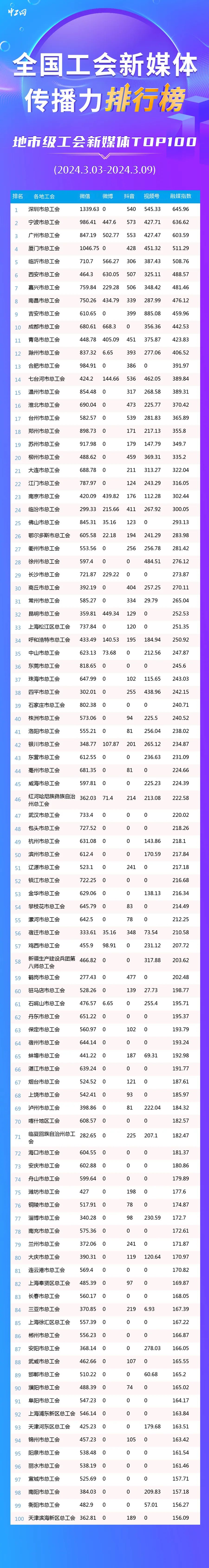 新一期全國地市級工會新媒體傳播力TOP100發布: