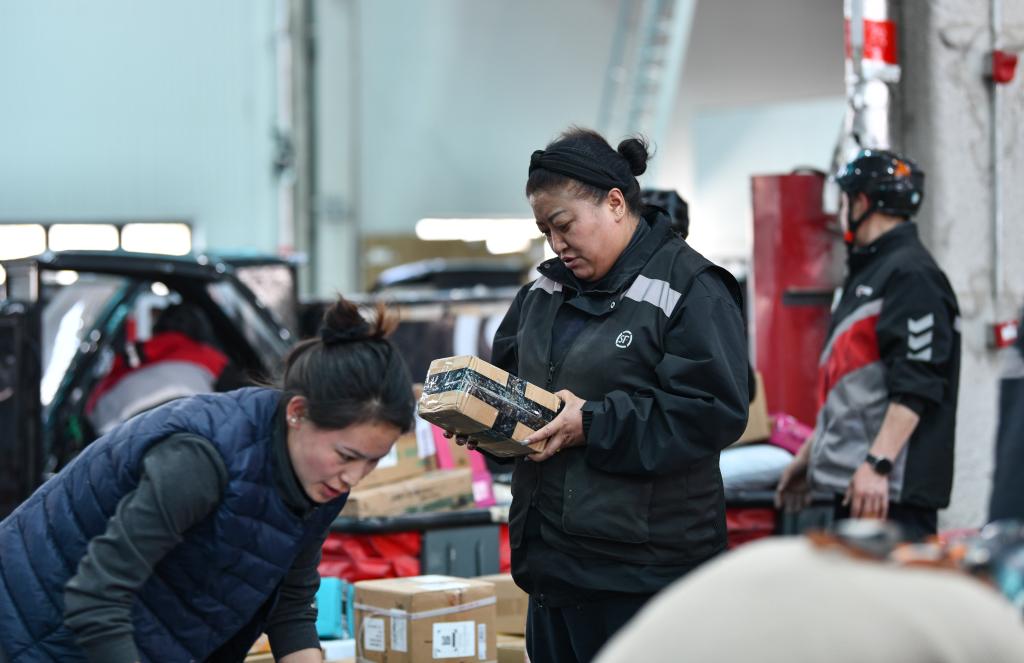 2024年4月22日,次仁措姆(中)和同事一起分揀快遞。新華社記者 晉美多吉 攝
