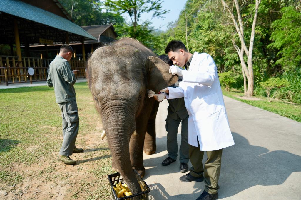 2024年4月25日,熊朝永(右)給救助象龍龍體檢。受訪者供圖