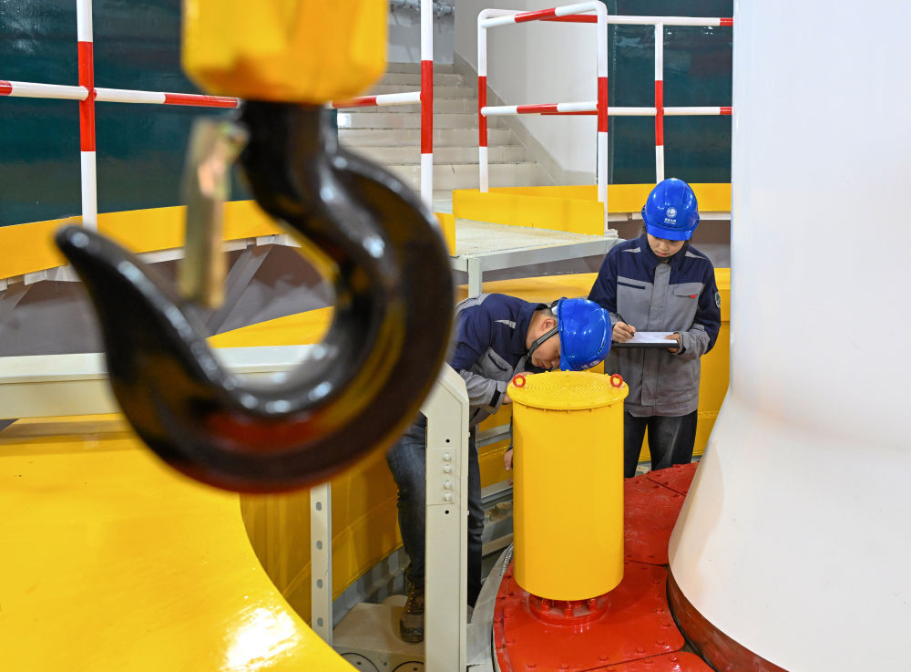 4月23日晚,工作人員在國(guó)網(wǎng)新源新疆阜康抽水蓄能電站地下廠房對(duì)3號(hào)機(jī)組進(jìn)行調(diào)試。新華社記者 陳朔 攝