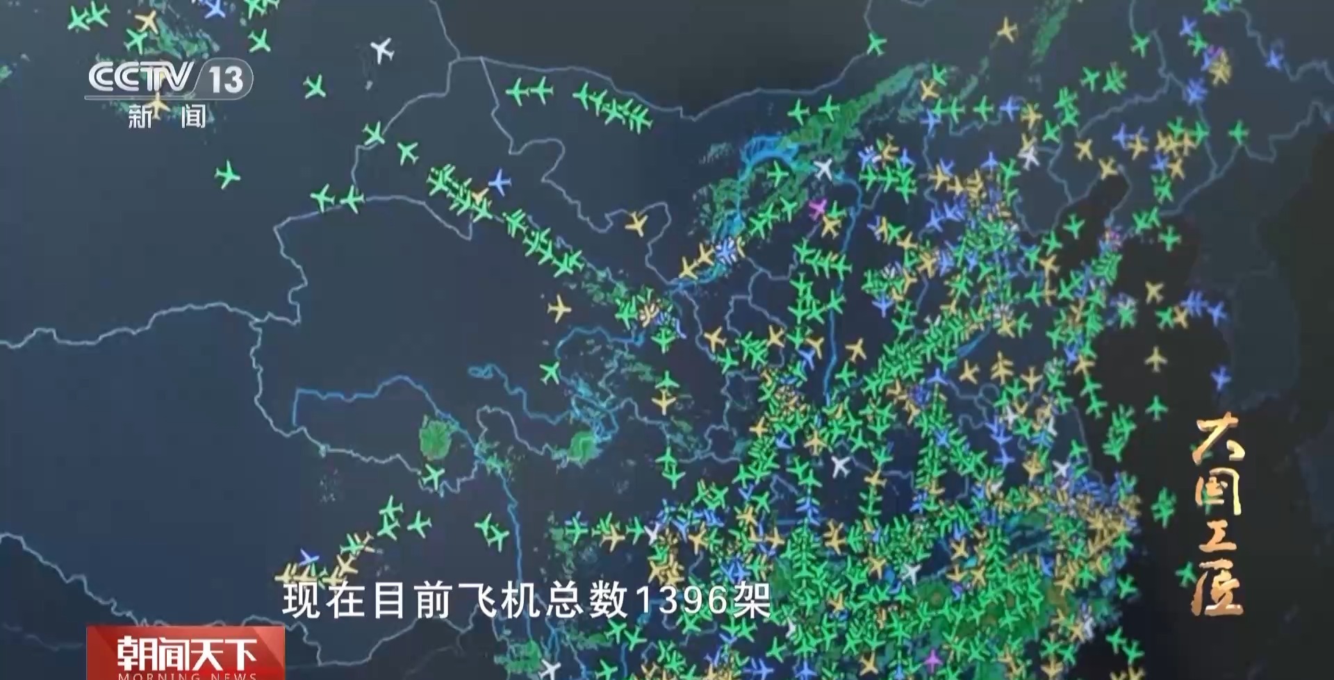民航數據通信有限責任公司首席科學家 朱衍波:屏幕顯示的是中國民航目前航班的運行實況,目前飛機總數1396架,密密麻麻。