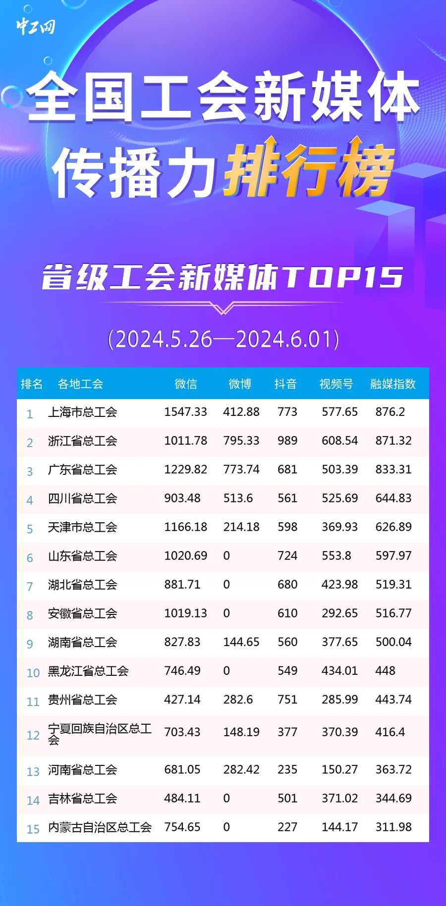 新一期全國省級工會新媒體傳播力TOP15發(fā)布: