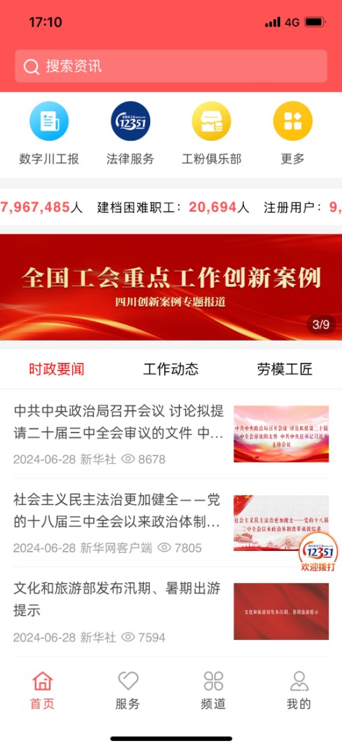 “政治性是四川工會數(shù)字化建設的首要出發(fā)點?!睋?jù)省總工會網社部相關負責人介紹,該平臺通過開設學習宣傳專欄、發(fā)布時政要聞、開展線上宣講活動、打造工會融媒體平臺等方式,及時傳播黨的聲音,不斷強化網上思想政治引領,增強網上工會的傳播力。據(jù)統(tǒng)計,該平臺已累計發(fā)布時政要聞8000余篇,總閱讀量超1.6億次,單篇平均閱讀量超2.2萬次。