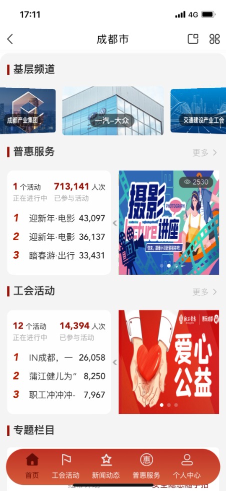 按照全總“559”工作部署要求,成都市總工會緊緊圍繞企業(yè)職工需要“什么”、產(企)業(yè)能得到“什么”、工會要做“什么”三個出發(fā)點,積極探索產(企)業(yè)工會頻道建設,打通服務職工“最后一公里”。目前已上線成都市交通建設工會、一汽大眾汽車有限公司成都分公司工會、成都軌道交通集團有限公司工會、成都產業(yè)投資集團有限公司工會4家產(企)業(yè)工會頻道,新建企業(yè)專屬服務場景6個,直接覆蓋12萬余名職工會員。
